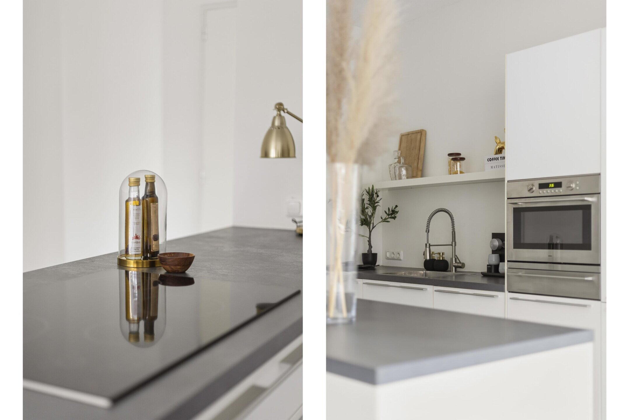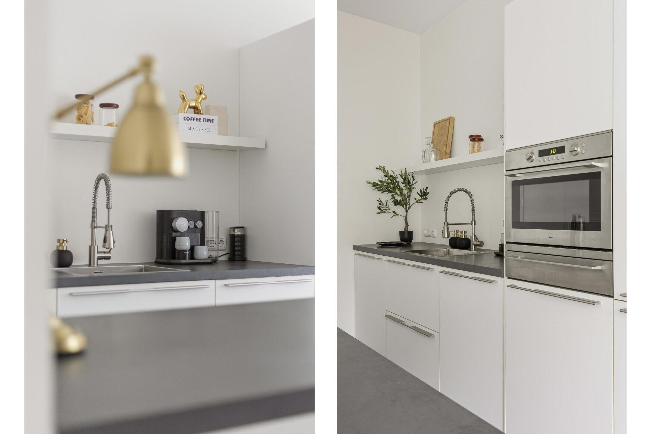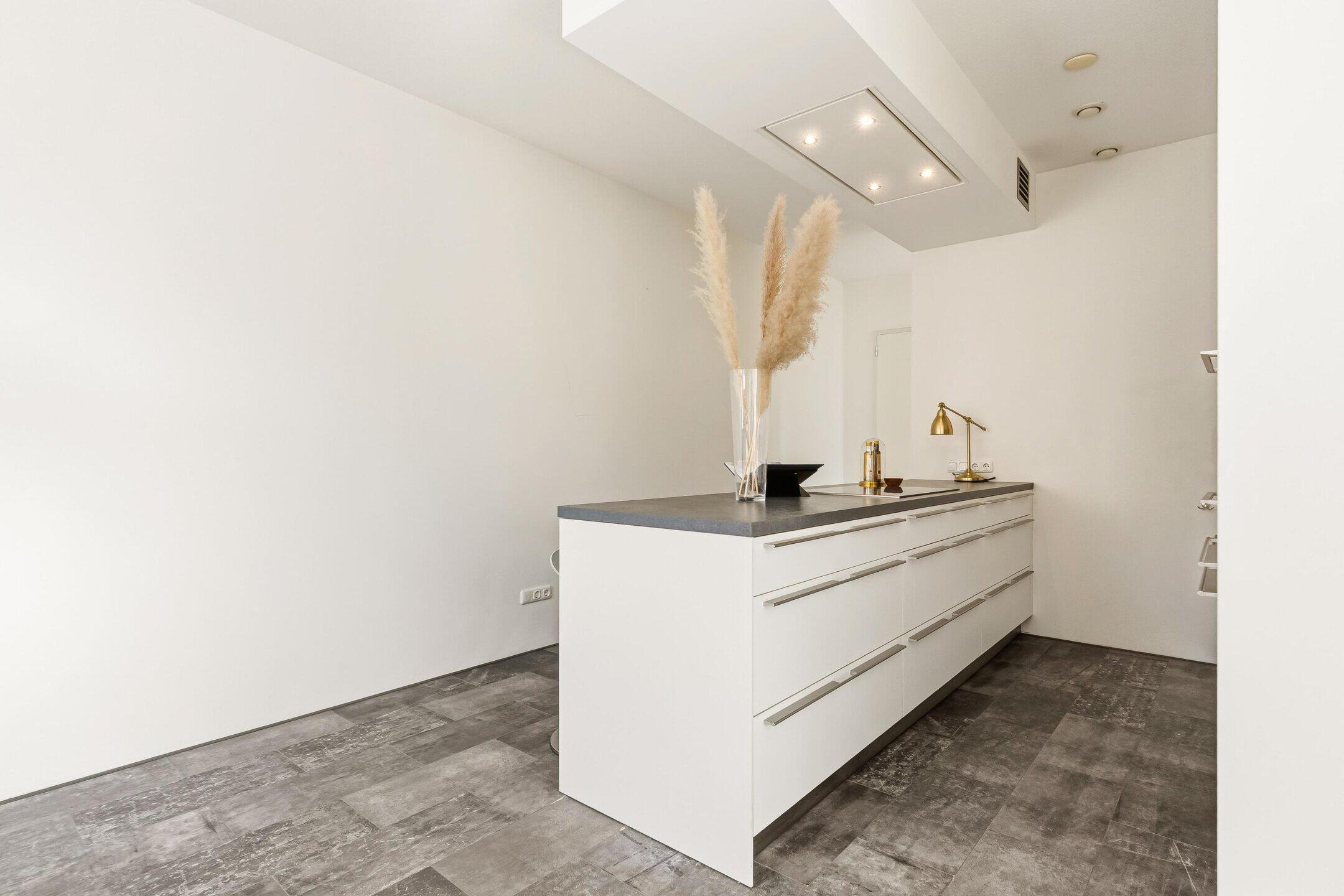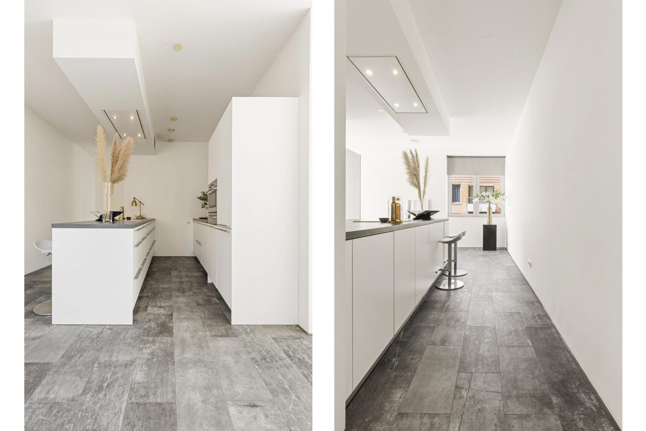 De open woonkeuken is strak en modern uitgevoerd en beschikt over een kook-/spoeleiland en diverse hoogwaardige inbouwapparatuur. Dankzij de royale oppervlakte is er volop ruimte voor een grote eettafel, waardoor een gezellige en uitnodigende eetruimte ontstaat.