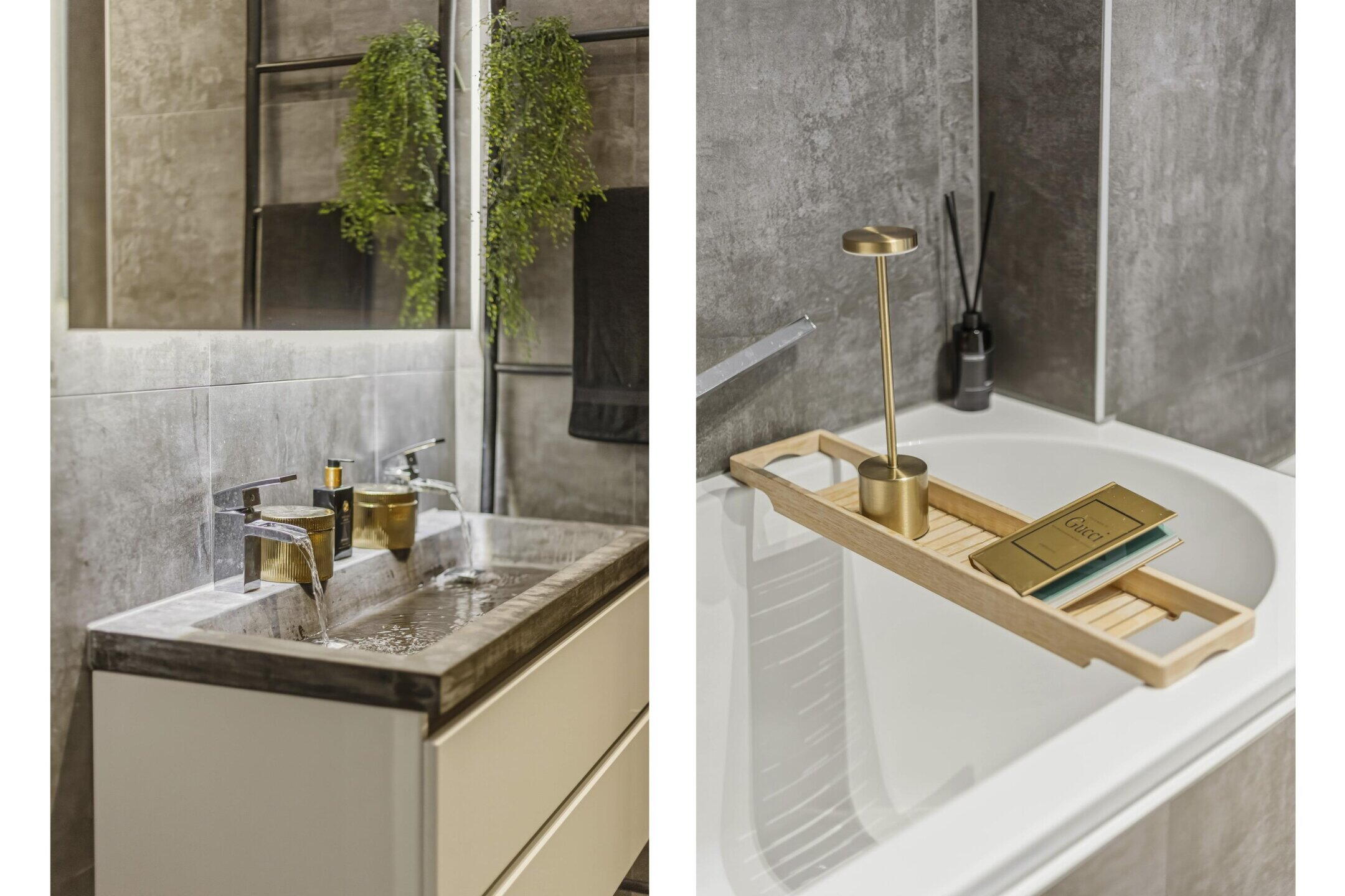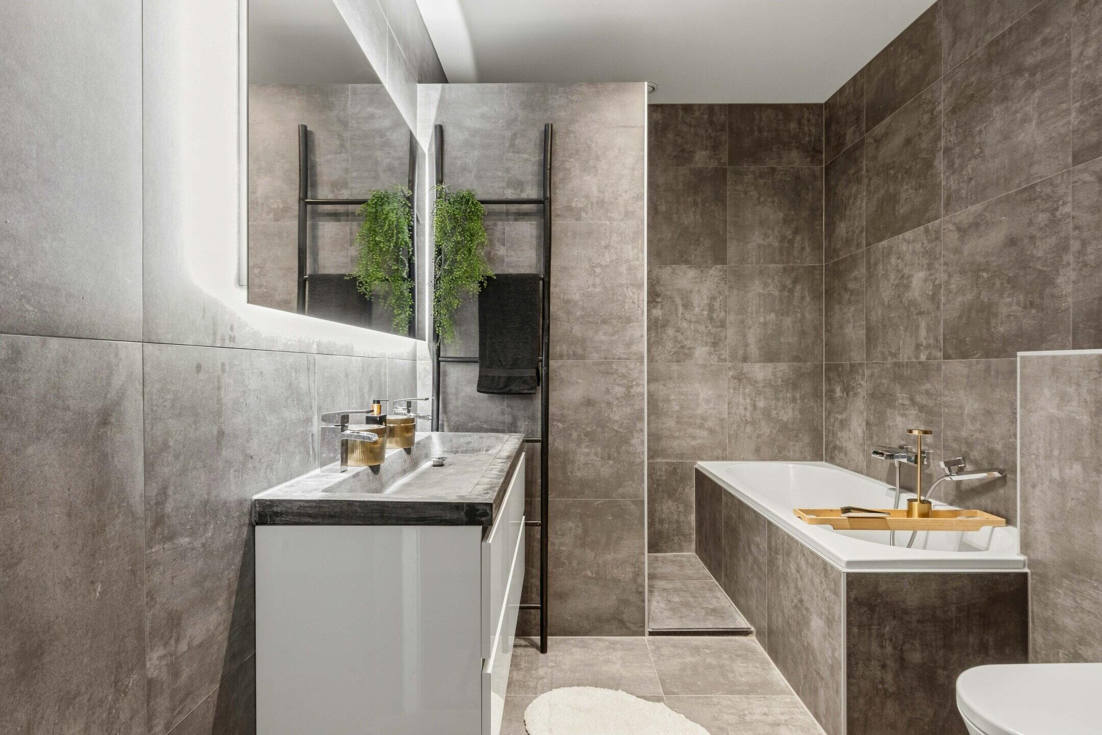 - Ligbad, toilet, dubbele wastafel, wastafelmeubel, inloopdouche