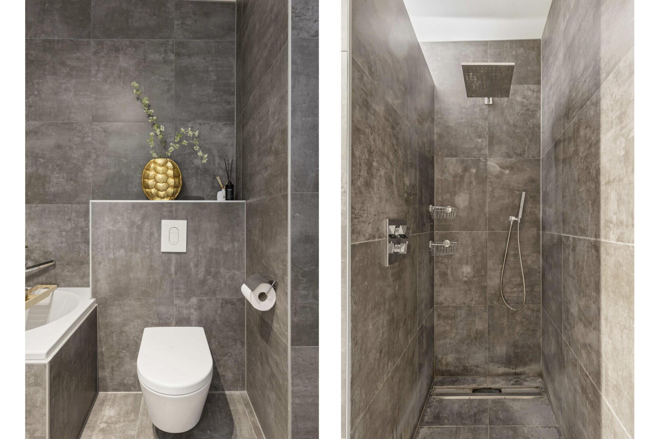 De luxe badkamer is modern en compleet uitgevoerd met een ligbad, een ruime inloopdouche, een dubbele wastafel en een tweede toilet.