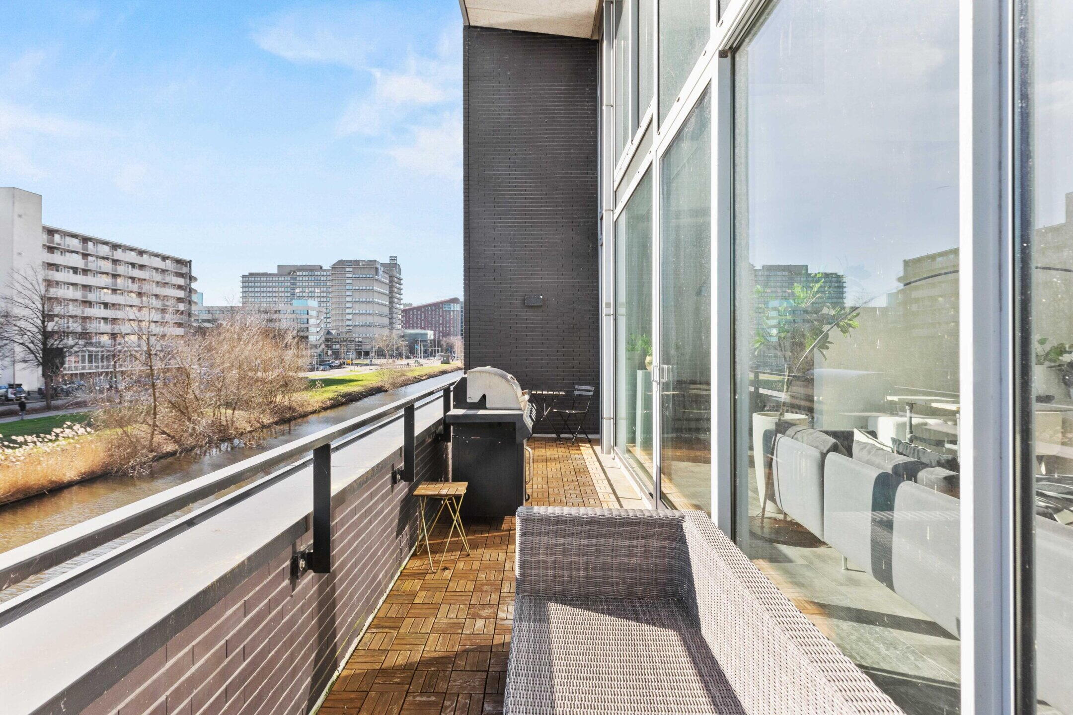 Via de schuifpui bereikt u het zonnige balkon op het zuiden, een heerlijke plek om te ontspannen en te genieten van het uitzicht over de Boelegracht.