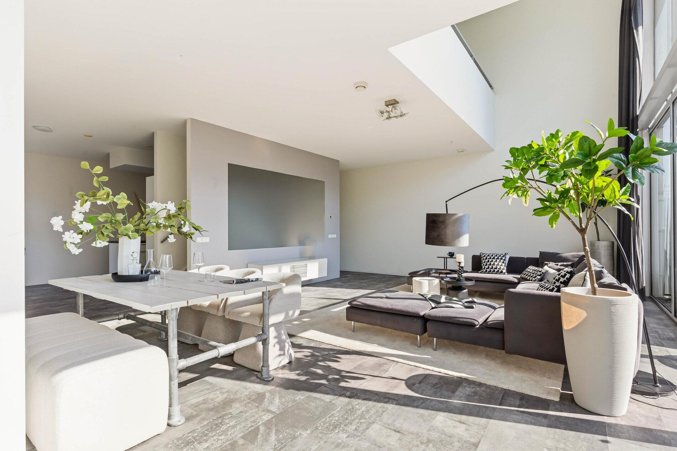 Op de benedenverdieping bevindt zich de royale leefruimte. Hier komt alles samen: een ruime woonkamer, een moderne woonkeuken en een indrukwekkende glazen pui over de volledige breedte van de woning. De raampartijen zorgen voor een overvloed aan daglicht en bieden een prachtig zicht op het water.
